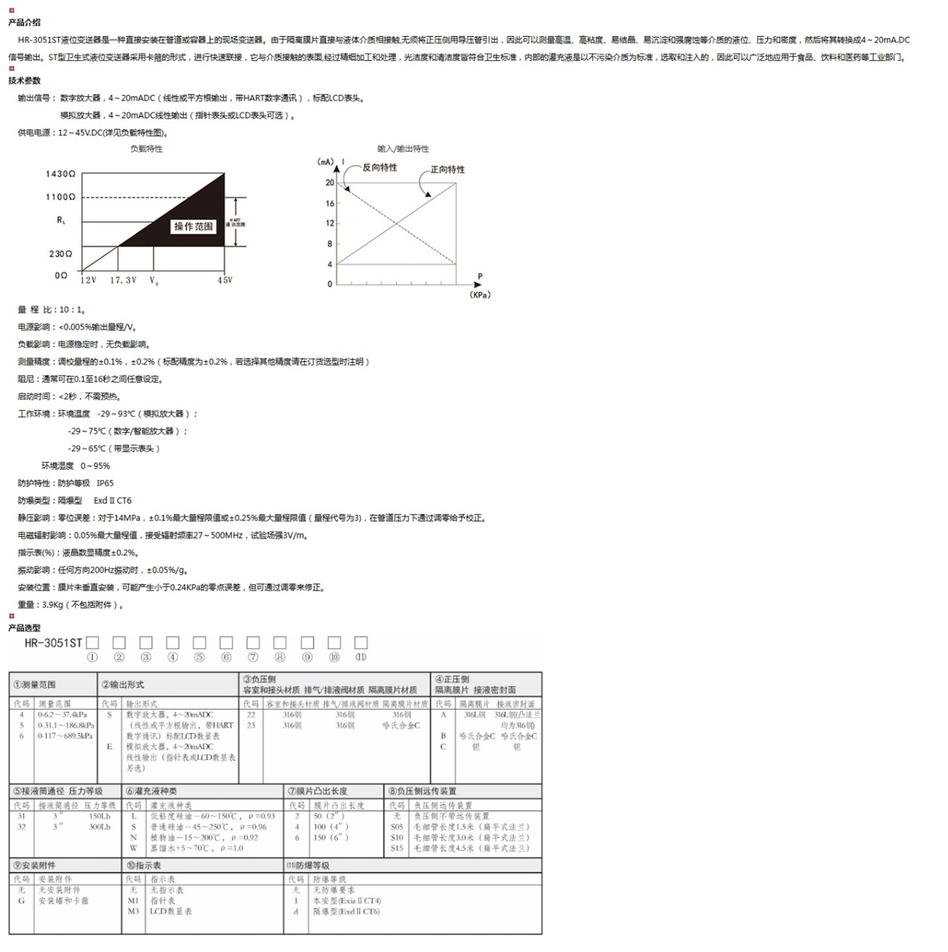 HR-3051ST液位變送器是一種直接安裝在管道或容器上的現(xiàn)場變送器。由于隔離膜片直接與液體介質(zhì)相接觸,無須將正壓側(cè)用導(dǎo)壓管引出,因此可以測量高溫、高粘度、易結(jié)晶、易沉淀和強腐蝕等介質(zhì)的液位、壓力和密度,然后將其轉(zhuǎn)換成4~20mA.DC信號輸出。
